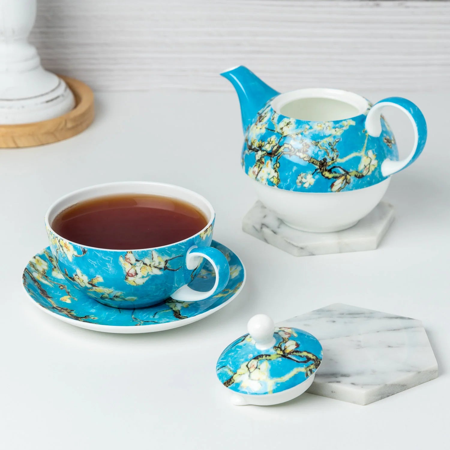 The tea for one crafted from high-quality bone china is an epitome of elegance and sturdiness. Includes teapot with lid, teacup and saucer.