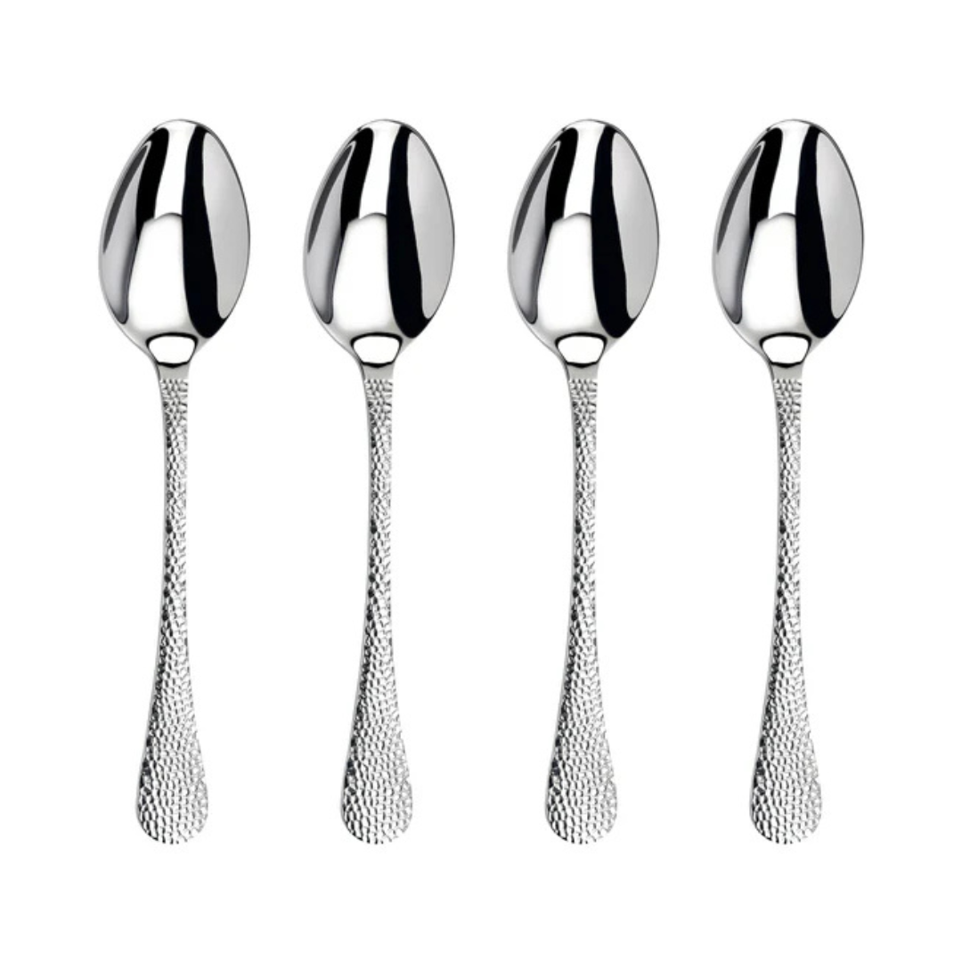 Avalon Set of 4 Serving Spoons.  Avalon beautifully combines traditional and modern design elements. Each piece has a hammered textured finish to the handle, which adds interest and perfect for catching the light and adding glamour to any table setting.
