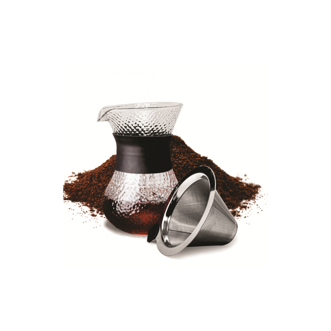 Pour-Over Coffee Carafe, 400ml, borosilicate glass with reusable stainless steel filter. Perfect for individually customized brews. Laser cut stainless steel filter with fine steel mesh layer enhances aromatic oils and rich flavours of coffee. Heat resistant, borosilicate glass carafe and stay-cool silicone sleeve.