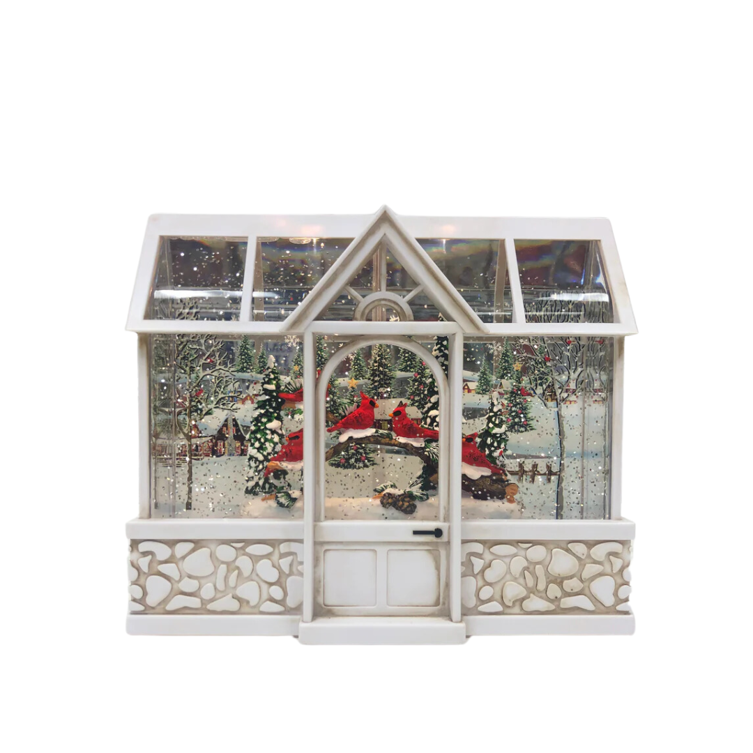 Illuminate your holiday decor with the Lighted Swirl Cardinal Greenhouse Lantern. This charming piece features a festive cardinal nestled inside a vintage greenhouse-style lantern. When lit, the water globe creates a captivating swirl of glitter, adding a magical touch to any room. The warm white LED light softly highlights the scene, creating a cozy and inviting glow. Compact at 7.75 inches tall, it fits perfectly in smaller spaces or complements larger displays.