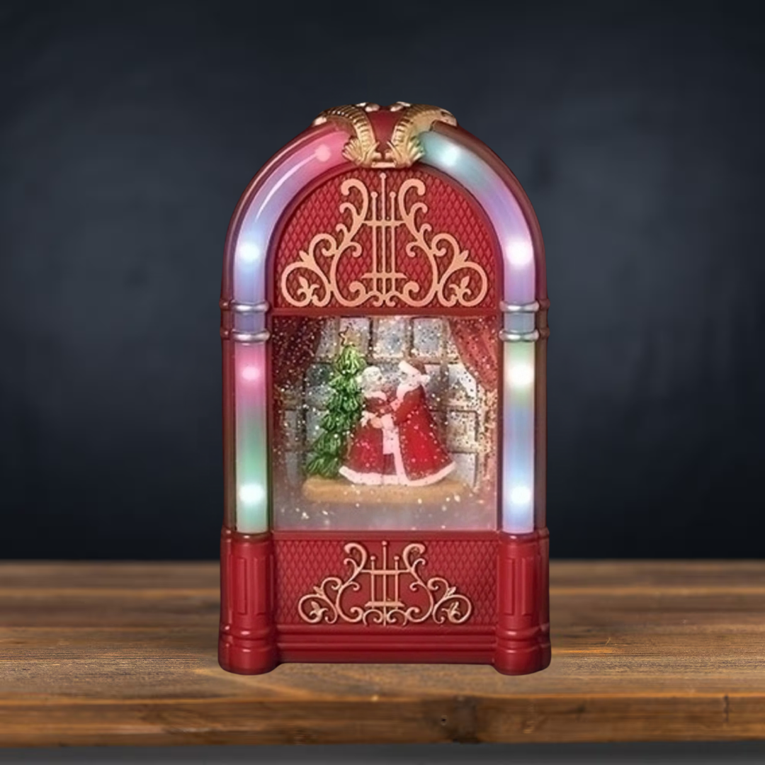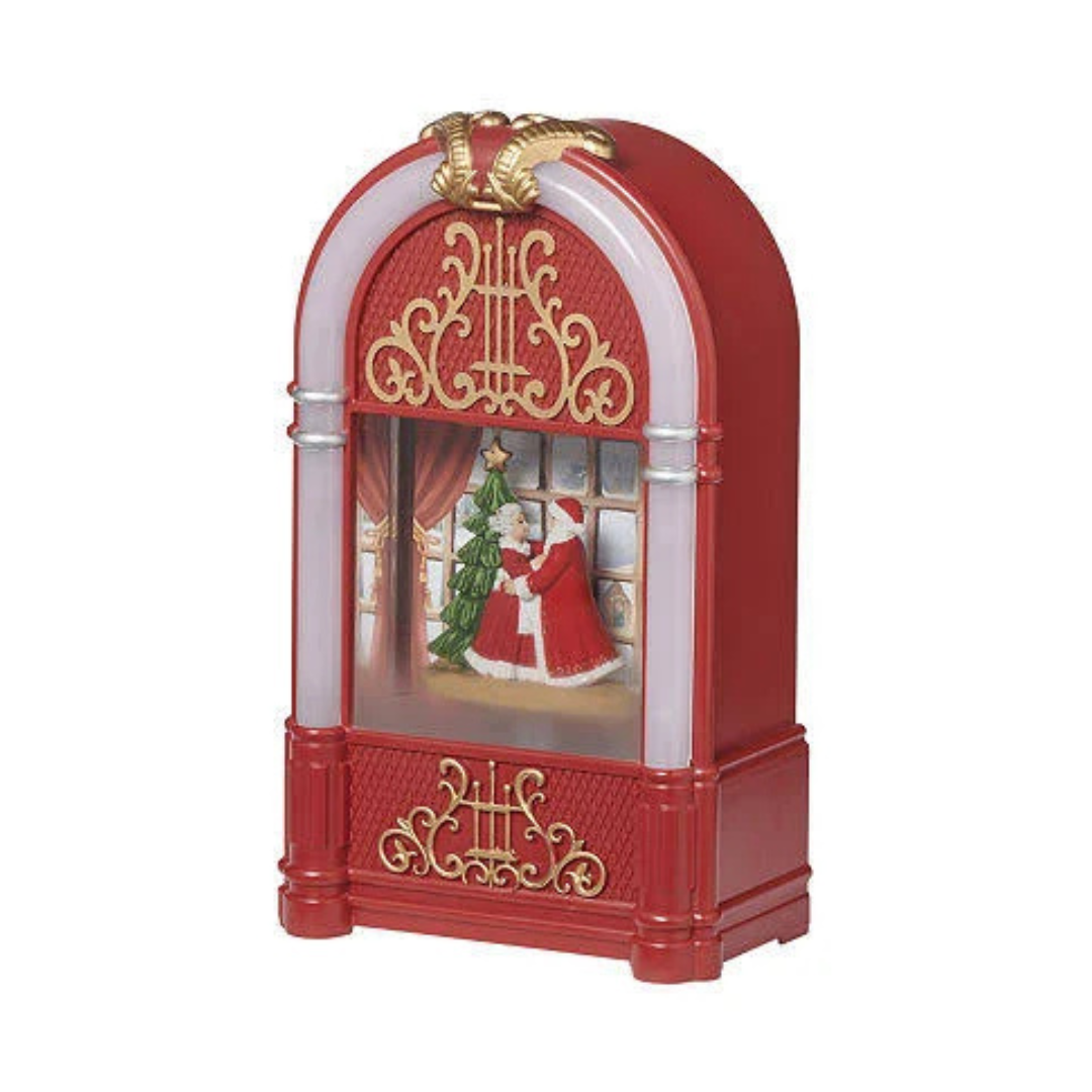 Bring festive cheer to your holiday décor with the Roman Lighted Juke Box featuring Dancing Santa and Mrs. Claus. Standing 9.75 inches tall, this charming piece combines nostalgic jukebox design with animated figures that dance to spread Christmas joy. Its built-in lighting enhances the warm, romantic ambiance, making it a perfect centerpiece for holiday celebrations or a unique gift for collectors.