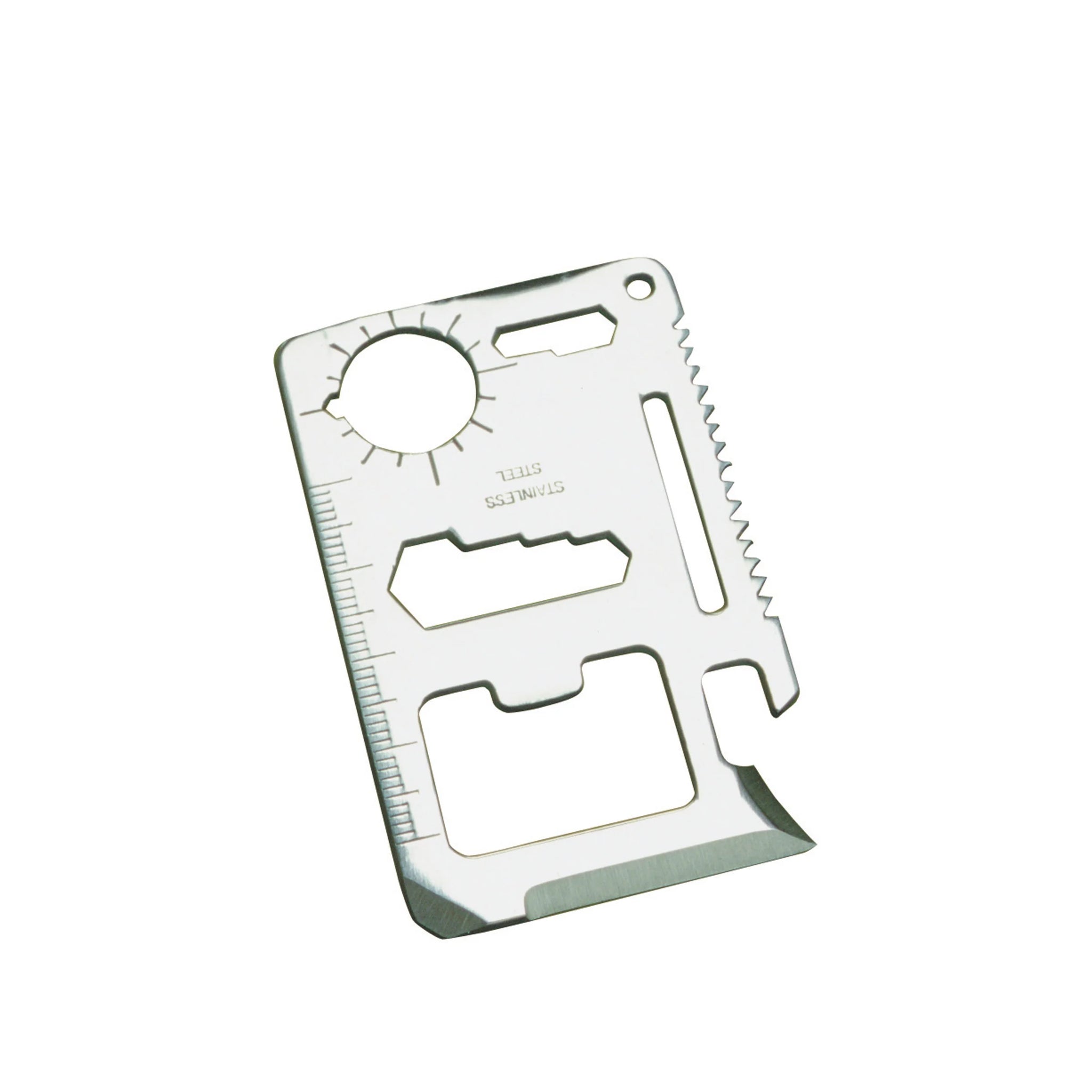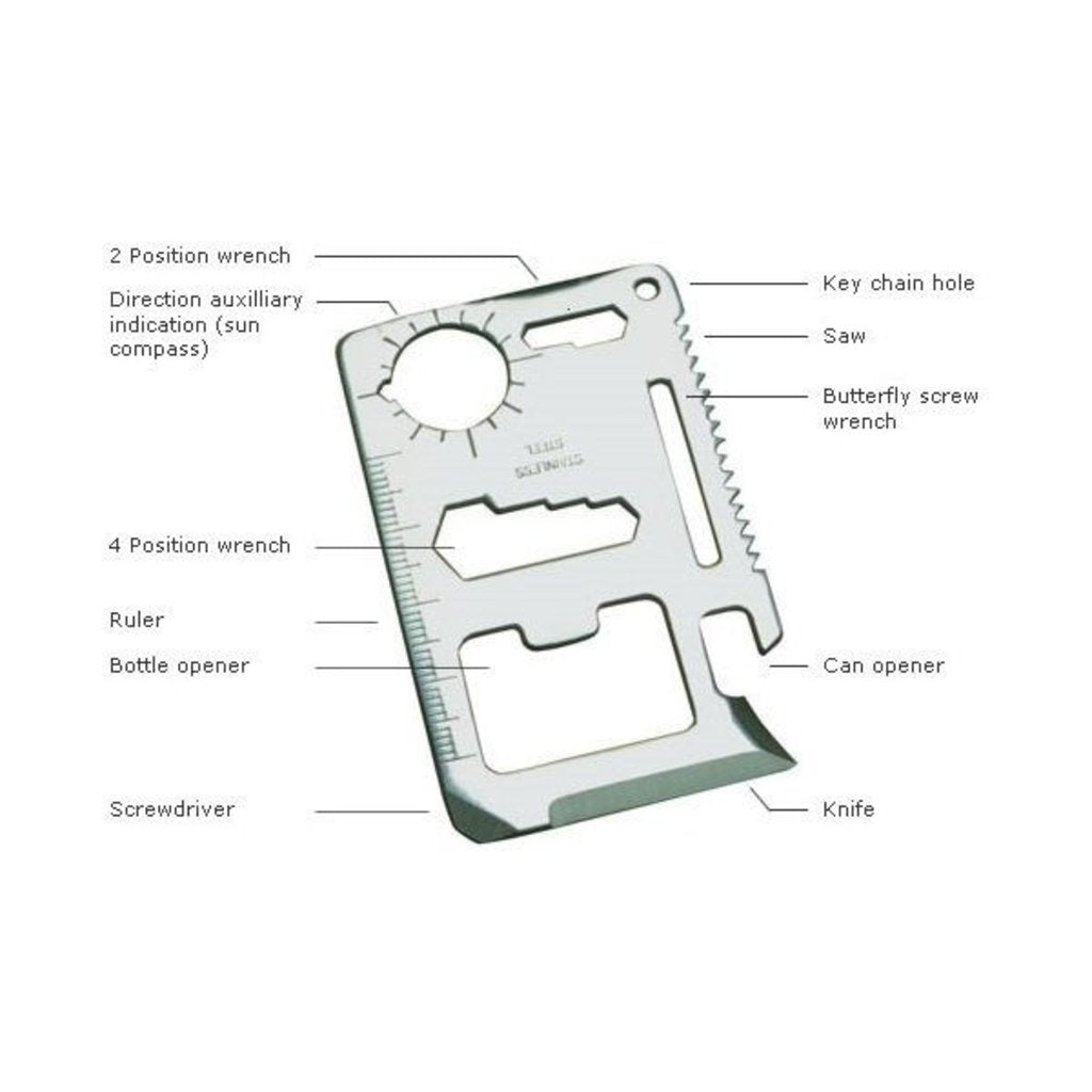 Carry this classic survival tool in your wallet and be prepared for anything. Includes: Can opener, saw blade, butterfly screw wrench, key chain hole, 2-position wrench, direction auxiliary indication, 4-position wrench, bottle opener, ruler, screwdriver, wrench, ruler, and one knife edge