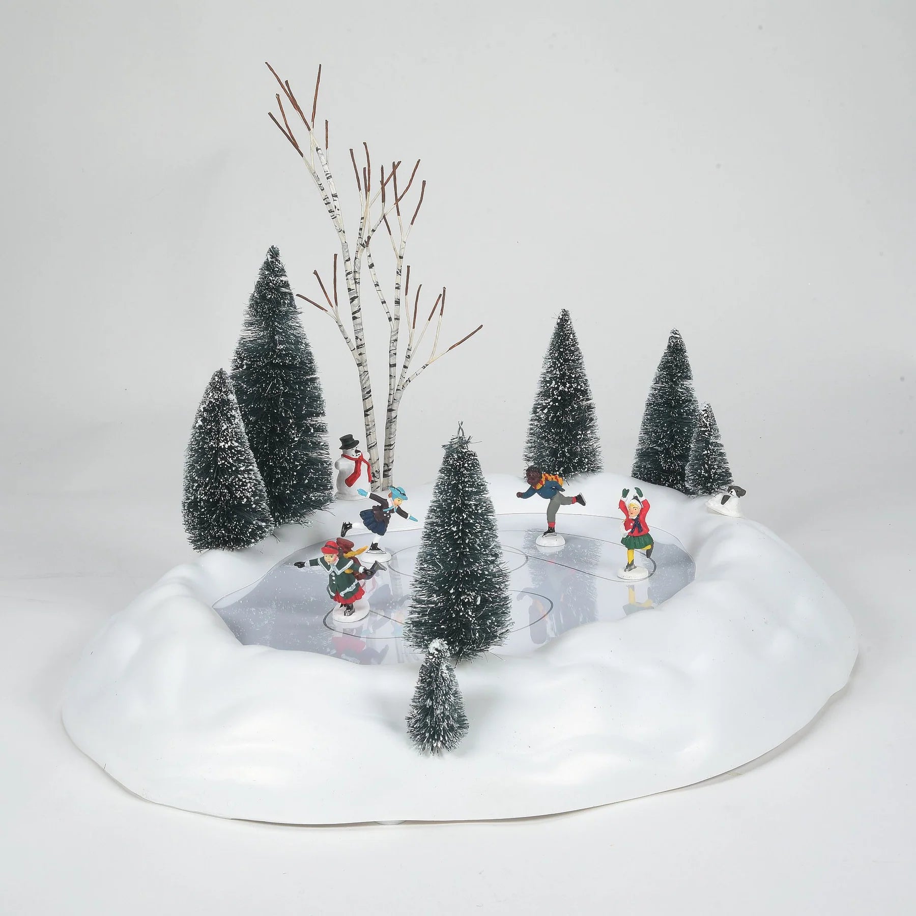Four sets of skaters glide around a tree lined pond. This set has its own power adapter included. Use Department 56 Cross Product accessories to enhance your Village display.