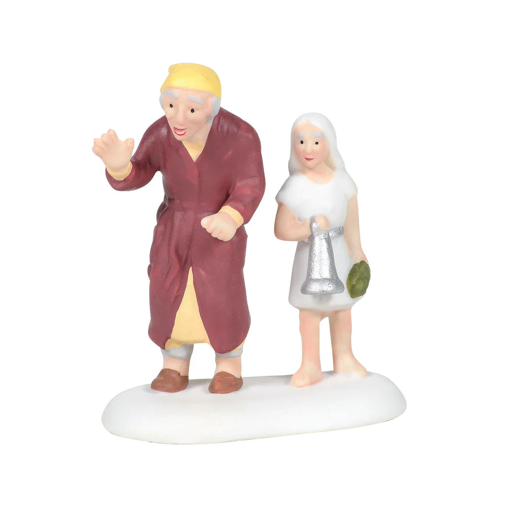 First in a grouping of 3, Scrooge meets the Ghost of Christmas Past, making several stops including one the home where Scrooge grew up. Set of 4 includes: "Scrooge with the First Spirit" accessory, sisal tree, and bag of snow.