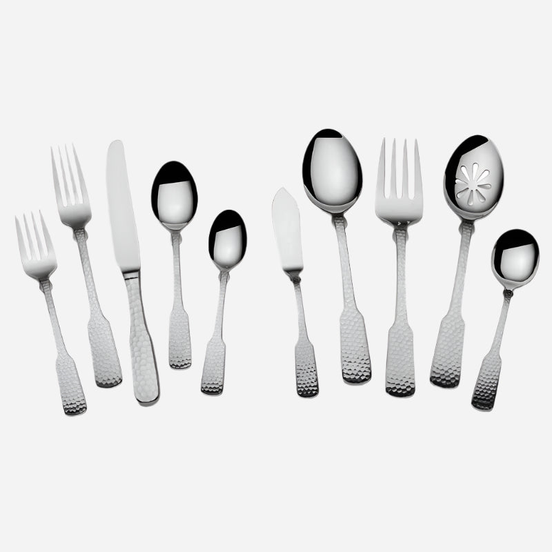 Towle Hammersmith Flatware is designed with a unique hammered pattern that will add an elegant touch to your table setting. Crafted of superior quality 18/10 stainless steel. Dishwasher safe. 45 piece set, service for eight, includes (8) each: dinner fork, salad fork, dinner knife, dinner spoon and teaspoon, plus (1) each: tablespoon, pierced tablespoon, cold meat fork, sugar spoon and butter knife.