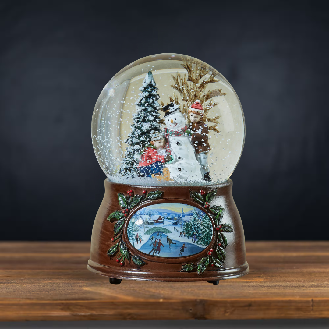 Enjoy the sounds of the holiday season with the Roman Kids Building A Snowman 100mm Musical Glitterdome features two children and their puppy are building a snowman. There is a large pinetree with snow on the branches and a bare branch tree. The elegant wood look base has a decal of people skating on the pond in the snow covered village. This wind up musical plays the tune "We Wish You A Merry Christmas"