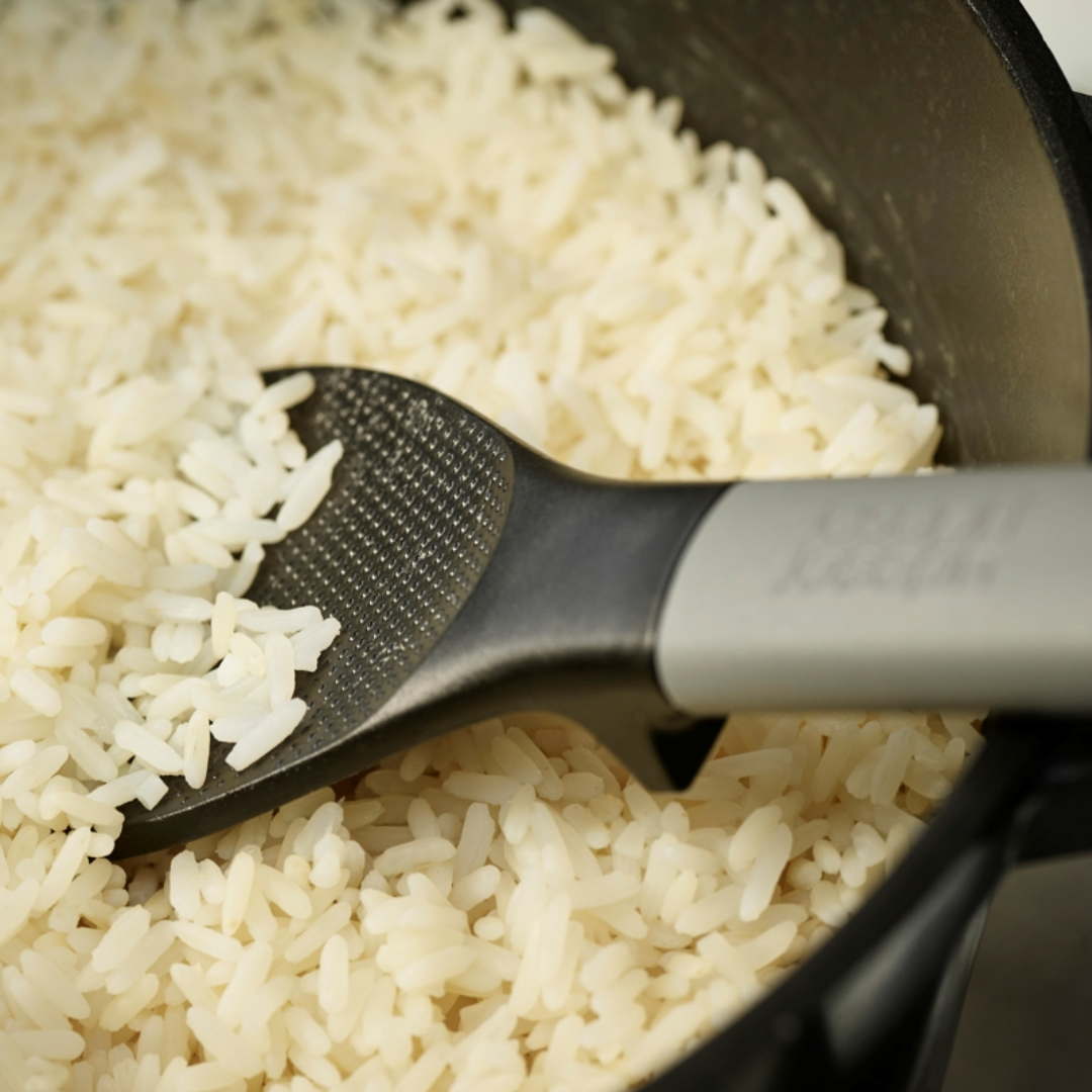 With a 20cm H (8") handle, this Rice Spoon incorporates Elevate™ technology to enhance cleanliness and minimize chaos. A built-in rest keeps the head from making contact with the counter when not in use. Its broad paddle-shaped head is perfect for fluffing and dishing out rice without harming the grains, and its textured surface prevents sticking. Appropriate for non-stick cookware.
