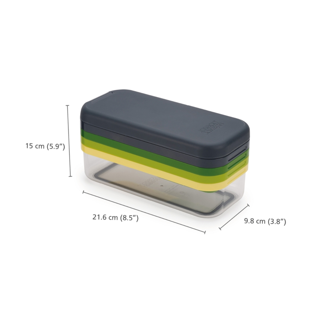 Do it all with the 4-in-1 Chop, Grate, and Slice Set (21.5 x 10 x 15cm H or 8.5 x 4 x 6")! Slice, dice, chop, and shred with four interchangeable blades. Plus, the container base keeps your food contained while you work and the finger guard adds extra safety. This set is non-slip and can be stacked for easy storage.