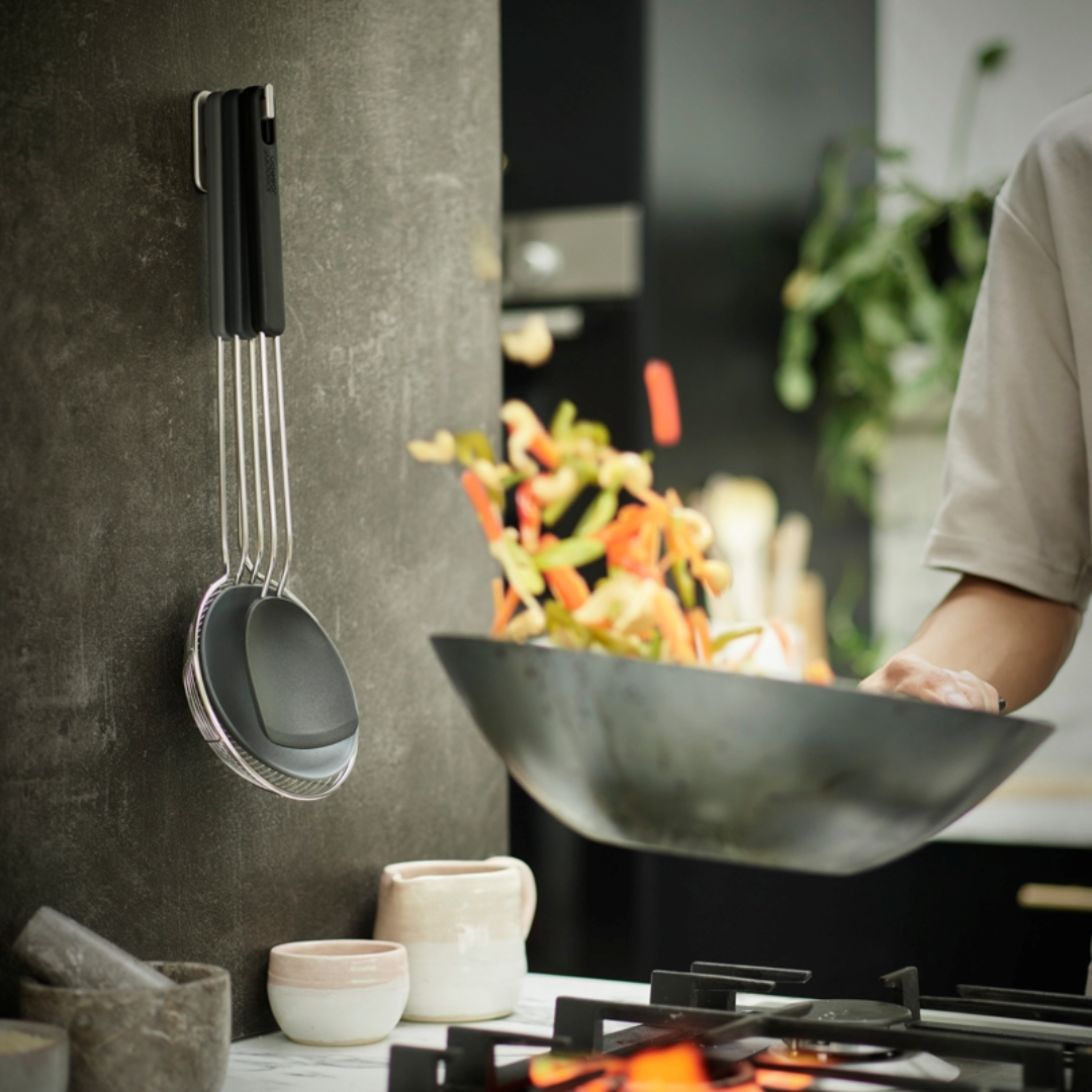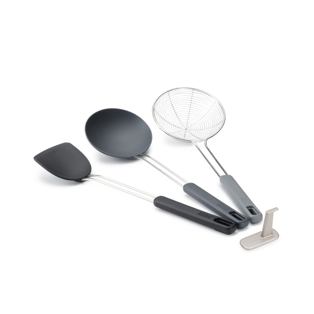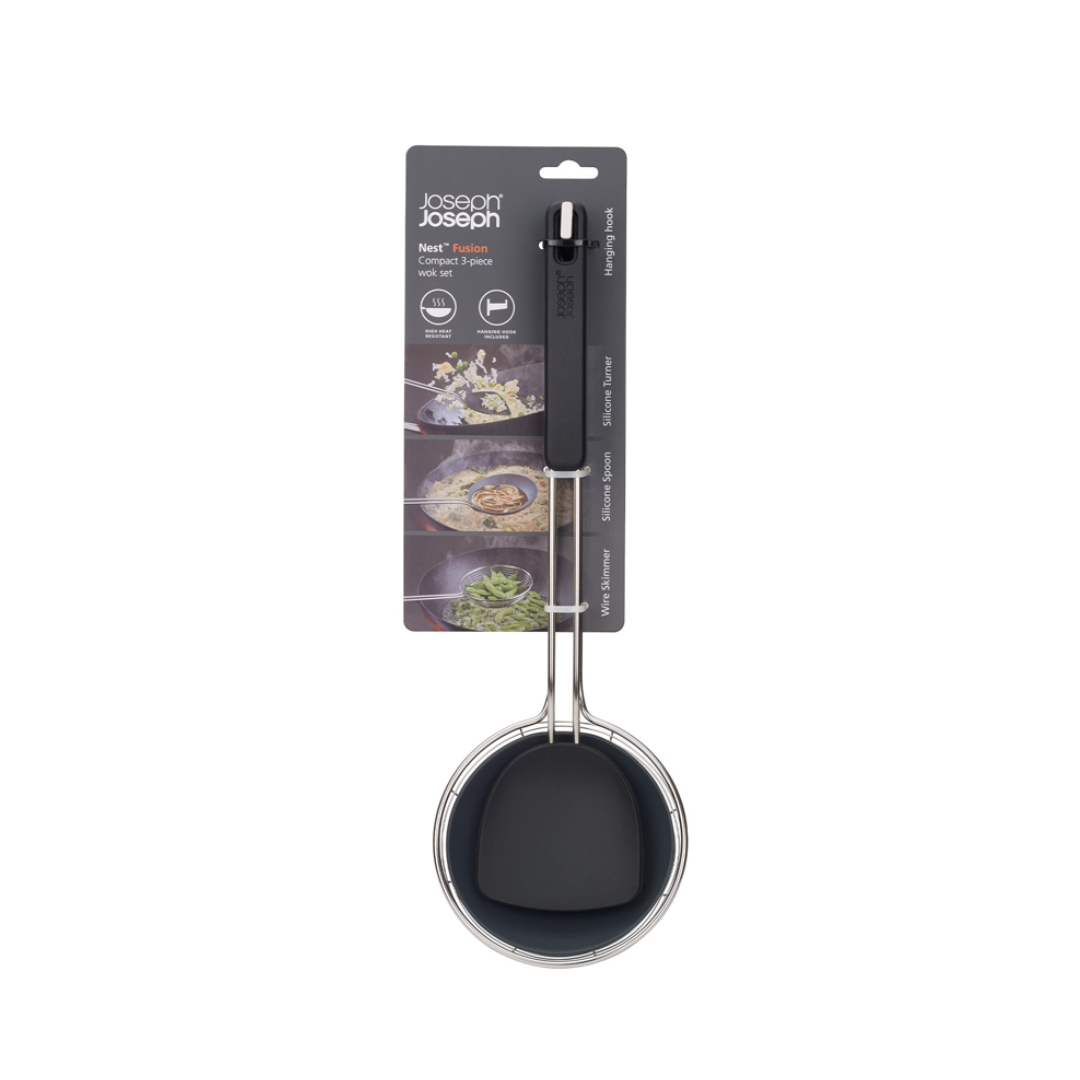 The Joseph Joseph Nest Fusion Wok Set of 3 is a 41.5cm H (16") set that includes a silicone turner, silicone spoon, and stainless-steel wire skimmer. Easily store these utensils by fitting the handles together and utilizing the included wall-mounted hanging hook. The silicone heads can withstand heat up to 270ºC/520ºF and are safe for non-stick cookware. The wire skimmer is ideal for scooping and draining food from hot liquids.