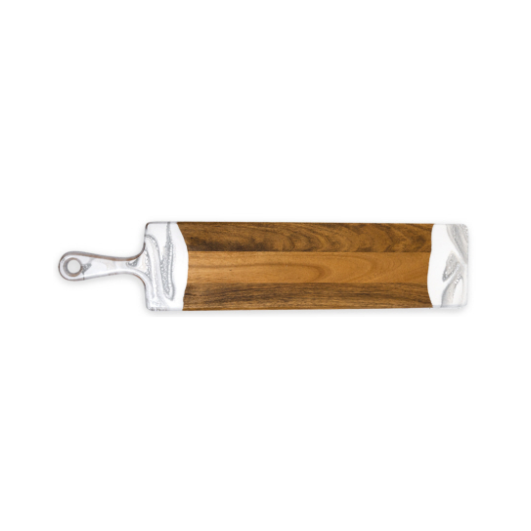 This baguette board made of Acacia wood and crafted with natural eco-friendly epoxy is totally unique and stylish.  Use it to serve homemade bread, baguettes, bruschetta, kebabs and more (5" x 24").