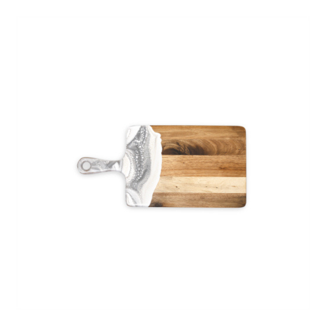 This cheese board is constructed with a unique blend of acacia hardwood and eco-friendly epoxy to be a one-of-a-kind piece that will wow your guests. Plus, it's sized just right- it's 8"W x 16"L.