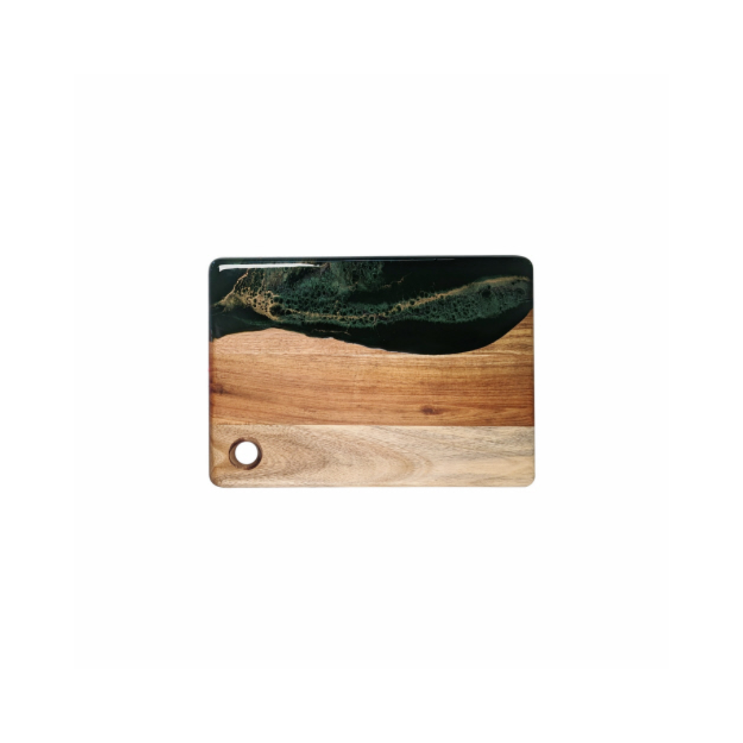This small cheese board is constructed with a unique blend of acacia hardwood and eco-friendly epoxy to be a one-of-a-kind piece that will wow your guests. Plus, it's sized just right—8"W x 11"L.