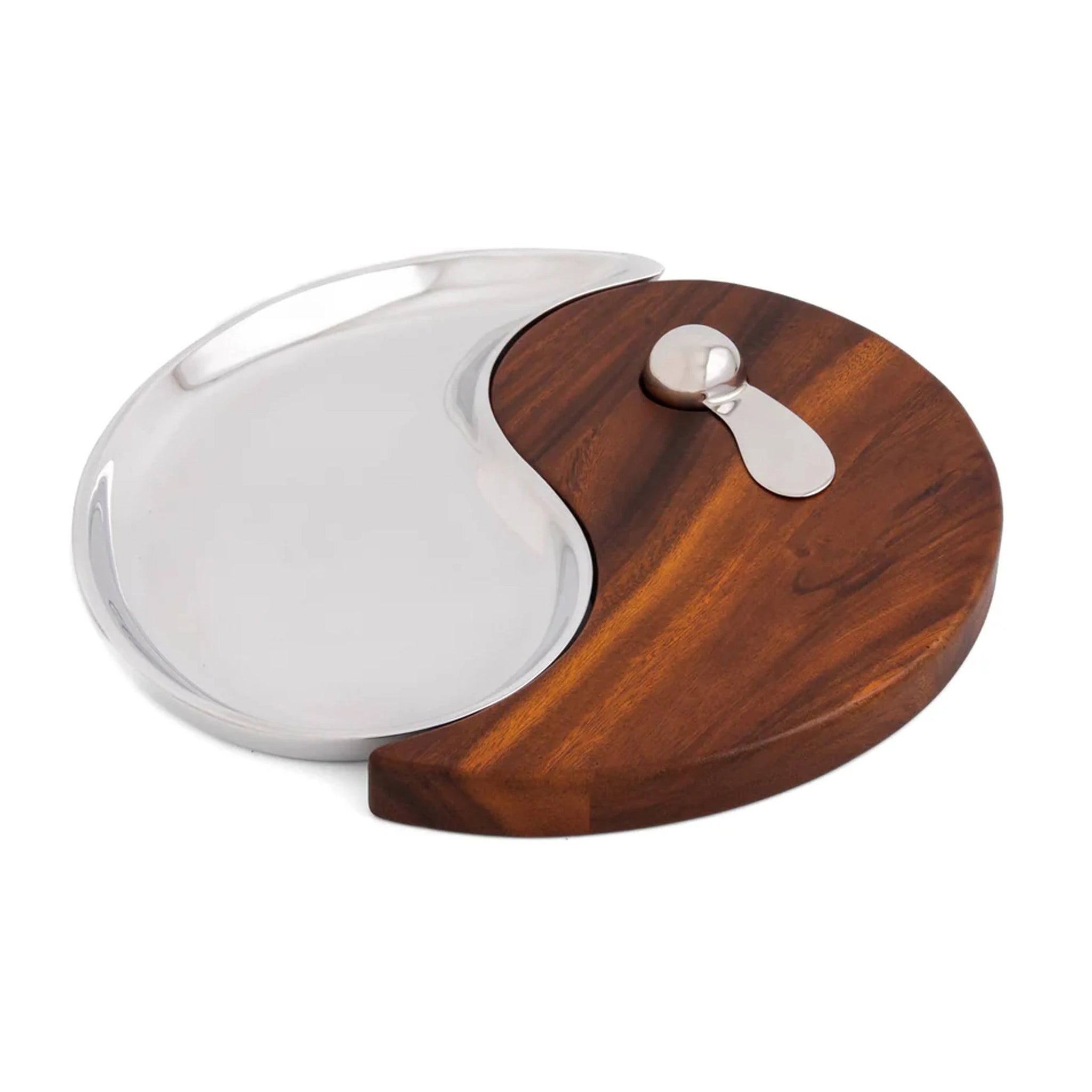 Serve cheese and charcuterie in style with the Yin Yang Cheese Board and Spreader. The wood cutting board with nestled spreader is graciously complimented by a Nambé Alloy piece that nests together and is an entertaining must-have.