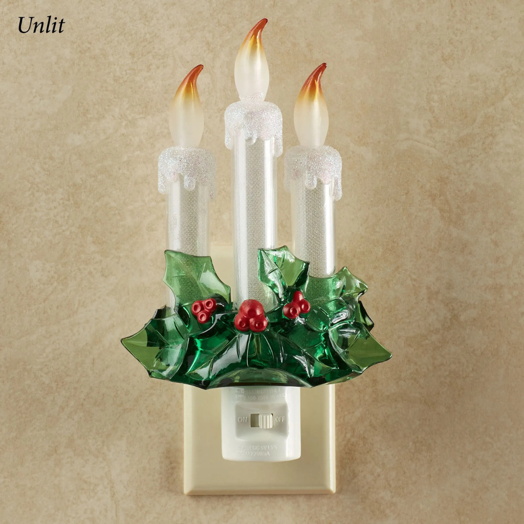 The Candles with Holly Nightlight offers a warm, festive glow with three LED candles and decorative holly. Its swivel plug fits any outlet, and the easy on/off switch is on the base. Compact and UL listed for safety.