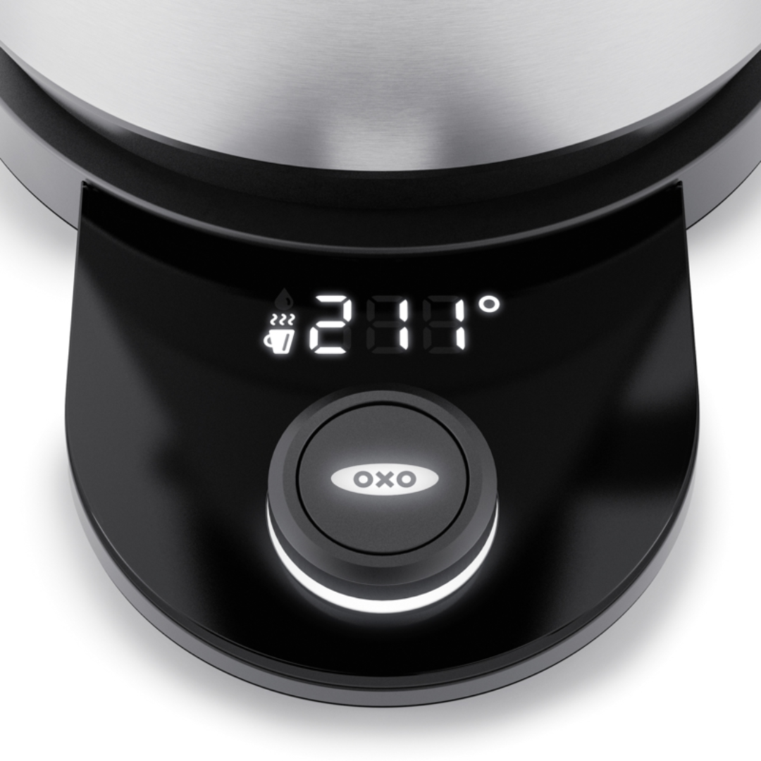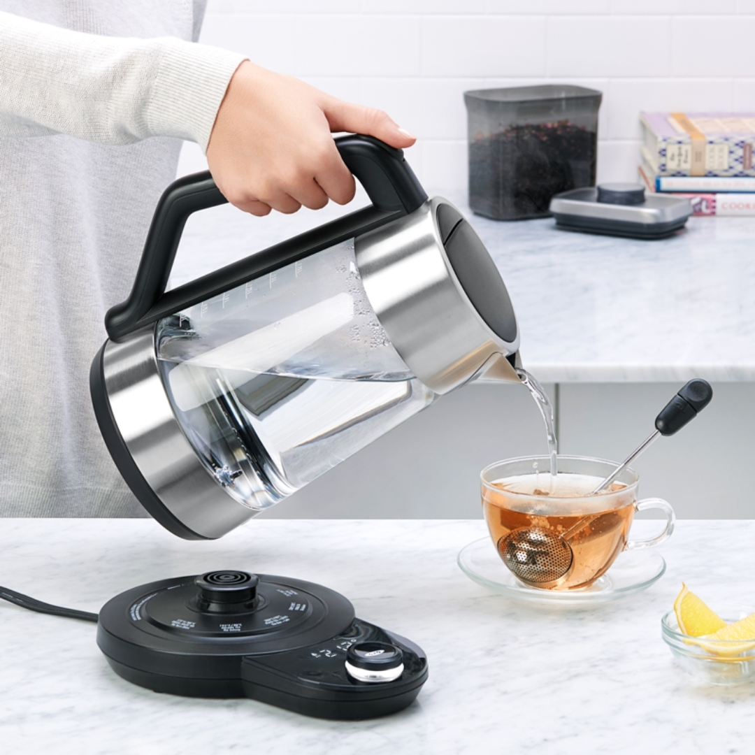 Cordless Adjustable Temperature Kettle, 1.75L (60oz), borosilicate glass and fingerprint-proof stainless steel. Allows you to create the perfect water temperature for your tea or coffee. Equipped with thoughtful features like auto shut-off, a stay-cool handle, easy-to-read measurement markings, and a soft-open lid. The cordless featur...