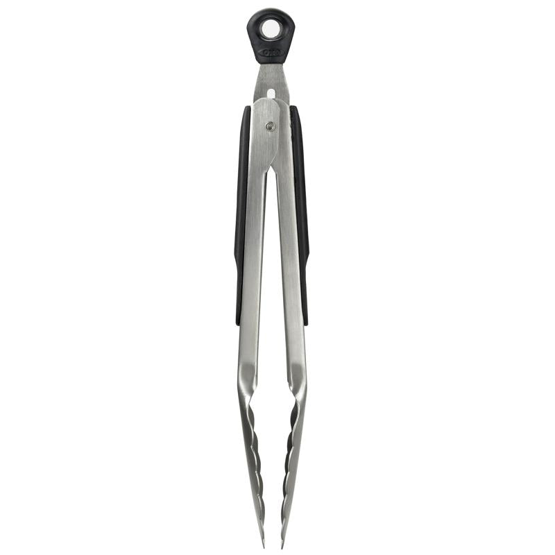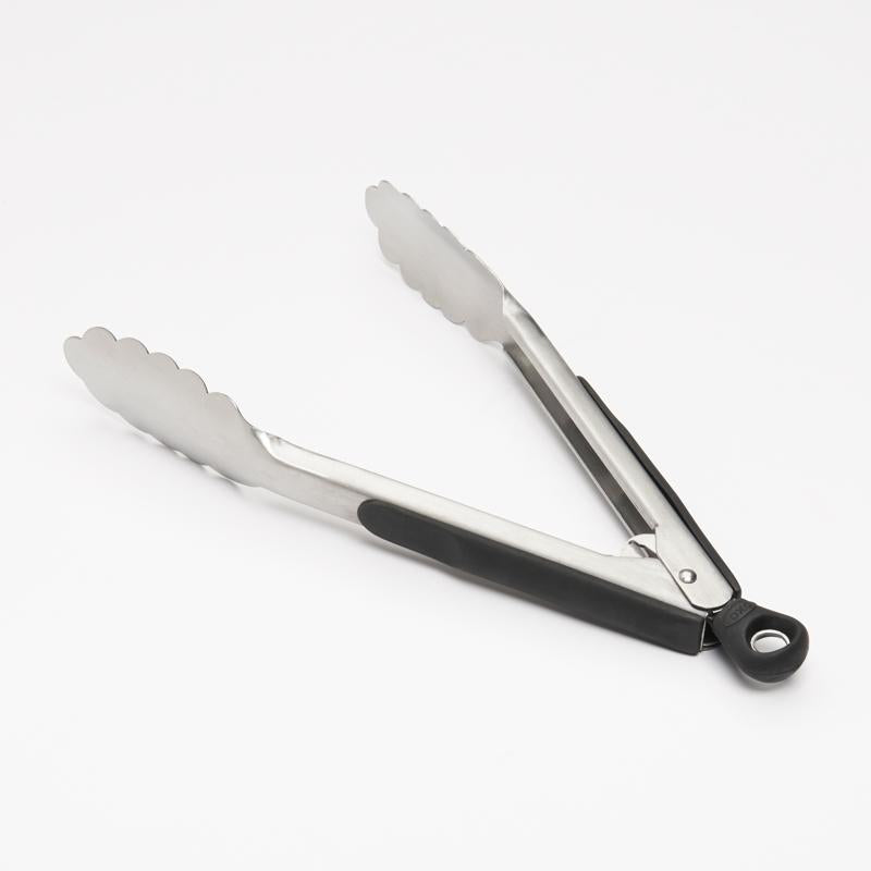 Tongs, 9"/23cm, stainless steel. Featuring soft, non-slip handles and comfortable thumb rests. Easily lock these tongs in the closed position for convenient storage. •The lock consists of a large pull-tab that doubles as a hole for hanging. Dishwasher safe.