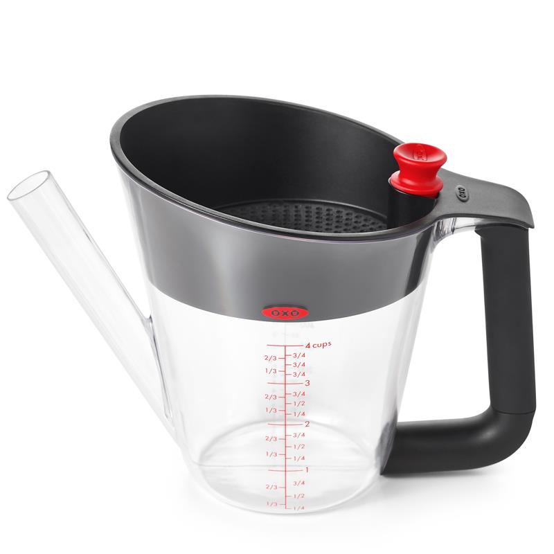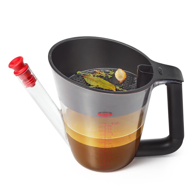 Fat Separator, 4 cup / 1L capacity, plastic, BPA free. Easily separates fat for healthier gravies, soups and sauces. The fat rises to the top and only the cooking liquid pours out of the spout. Simply place the stopper in the spout to keep fat out while you pour. Equipped with a built-in strainer that catches unwanted bits.