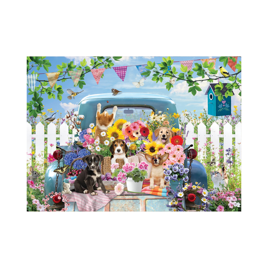 A cheerful summer 500 piece puzzle featuring a vintage country truck overflowing with flowers, foliage, and furry companions.
