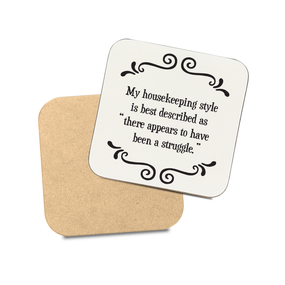 My housekeeping style is best described as “There appears to have been a struggle” Size: 3.8125 x 3.8125 Heavy duty, durable melamine with a smooth and shiny surface that is easy to clean. Each coaster is backed with protective cork.
