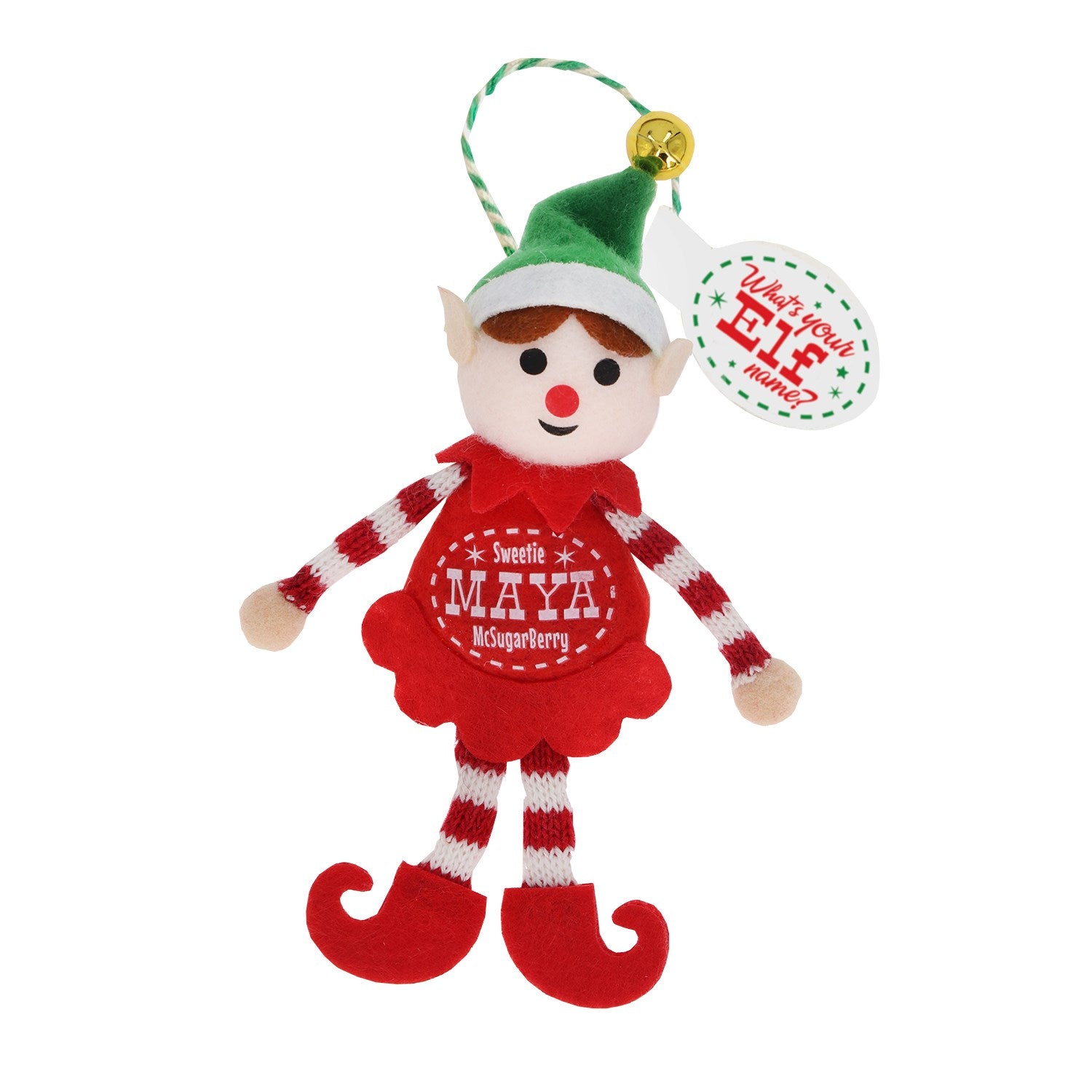 Personalized Christmas Elf Shelf & Tree Ornaments add a unique touch to any festive display. Featuring a personalized combination of your name and an Elf name, these plush fabric figures will look perfect perched on shelves or hanging from trees.