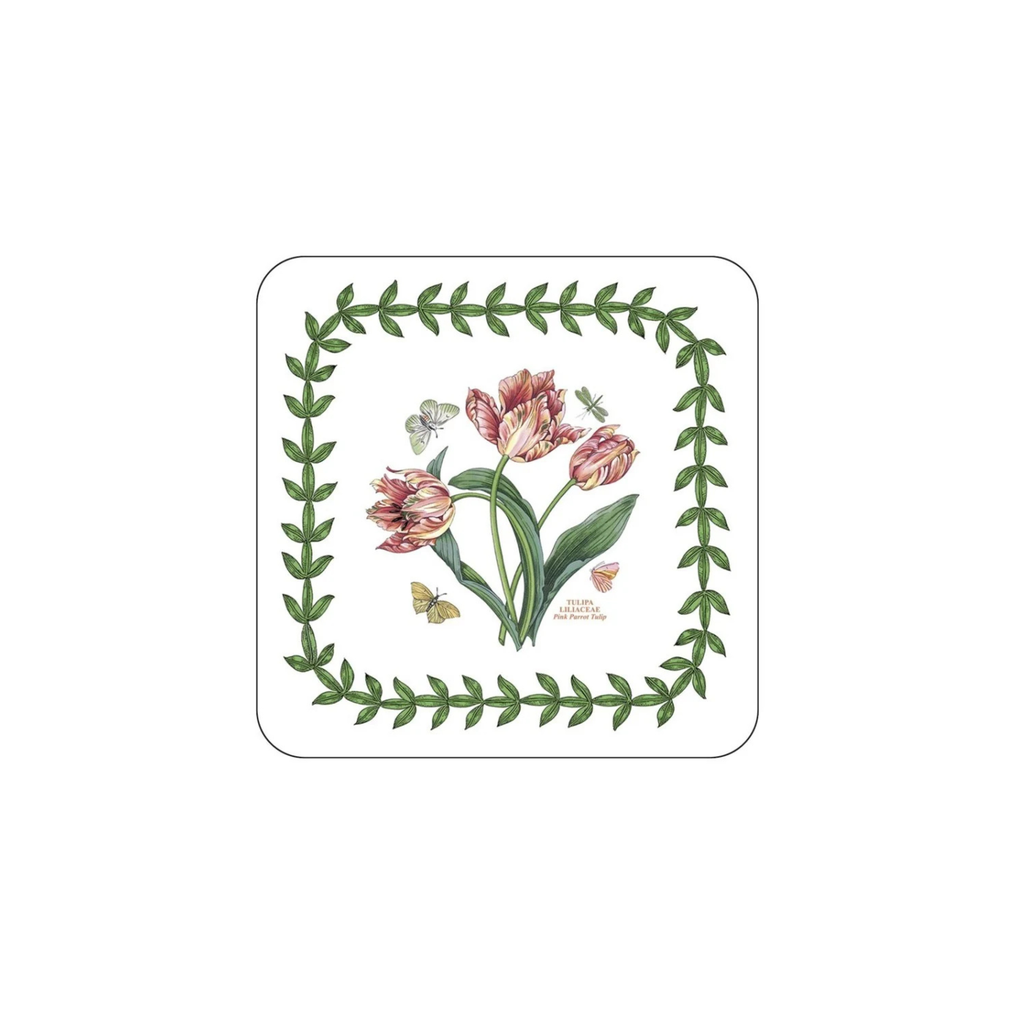 Pimpernel Botanic Garden coasters, assorted floral design coaster set of six different colorful flowers against a white background. The soft cork backing protects your dining table