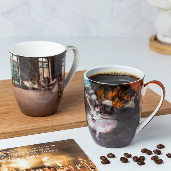 Bring a touch of elegance and art to your daily coffee ritual with this stunning fine bone china mug pair featuring the iconic paintings "The Star" and "The Rehearsal" by Old Master, Edgar Degas. These mugs not only showcase the masterful brushstrokes and unique composition of the painting, but also serve as a functional and practical piece for your coffee time. These are made of fine bone china, which is elegant, durable, lightweight and easy to clean, making it perfect for everyday use.<...