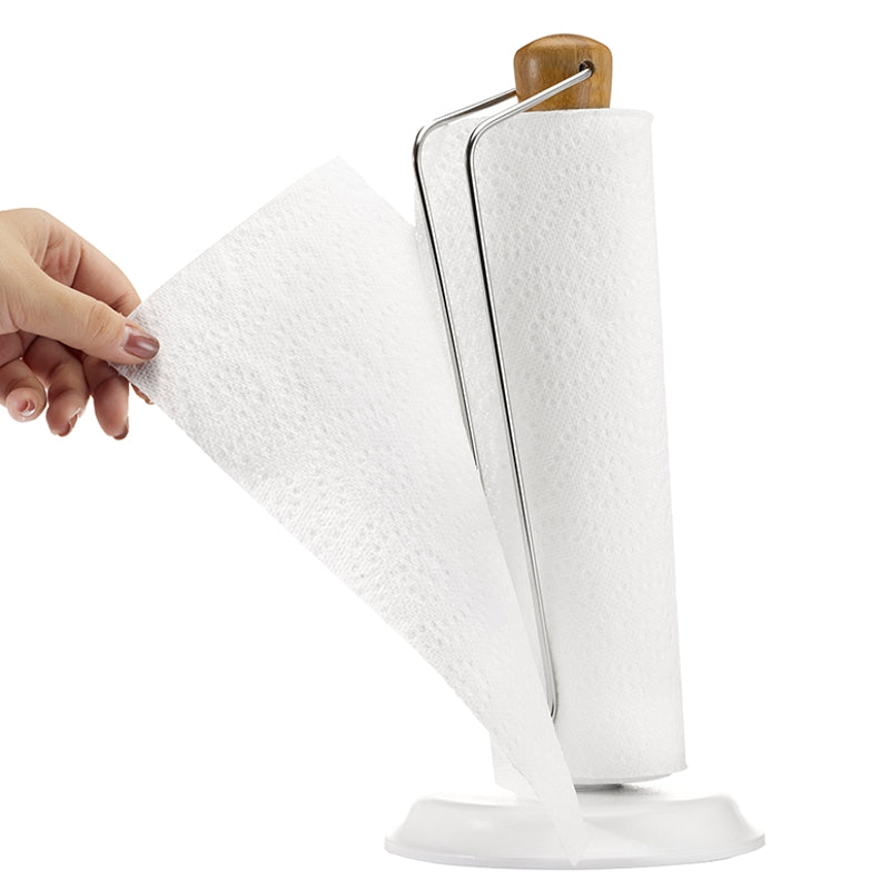 FULL CIRCLE Roll Model™ Paper Towel Holder: 34.5cm H, white. Made of recycled aluminum with a white ceramic base and bamboo handle. The weighted arm holds the roll while you pull and prevents wasted paper.
