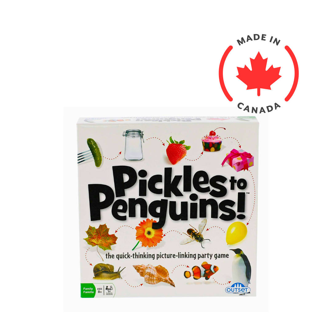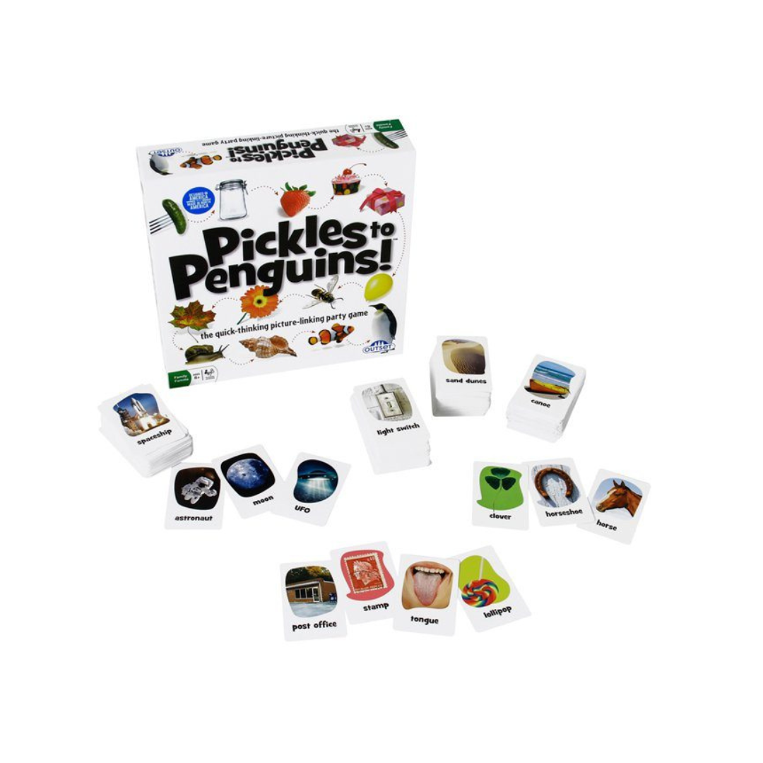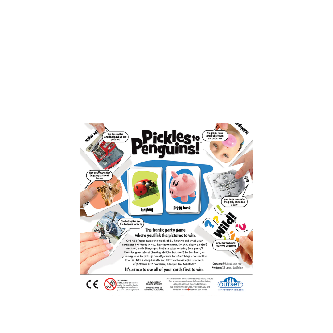 AGES 8+ | PLAYERS 2+ | It's an all-out race--Pickles to Penguins is a fast-paced picture-linking party game. Link what cards share: color, a salad, a party? Lateral thinking essential--haste = penalty cards. Hundreds of pictures--how many can you link?